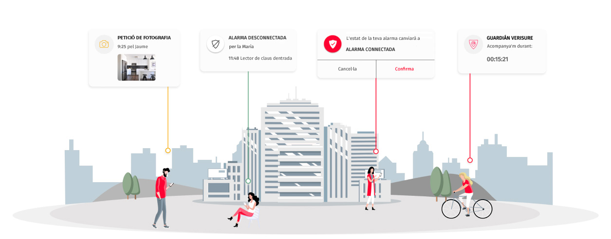 Amb My Verisure, pots controlar des de qualsevol lloc el teu sistema d'alarma i supervisar —amb àudio, imatges i notificacions en temps real— tot el que passa a casa teva o al teu negoci. A més, podràs demanar ajuda davant de qualsevol emergència, siguis on siguis, gràcies al servei Guardián Verisure.